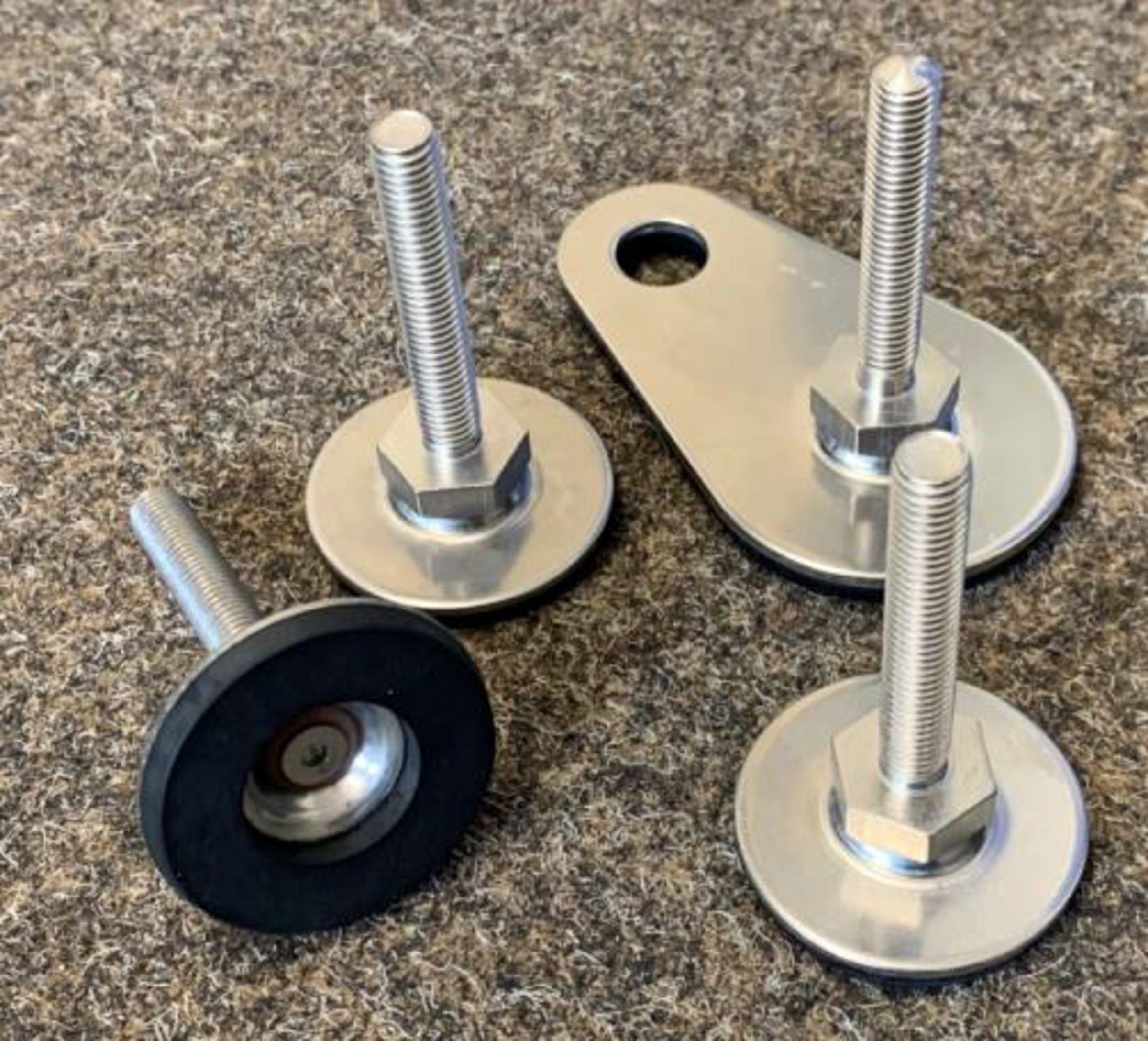 3 Stellfüße Edelstahl unten gummiert mit 6° beweglichem Fuß +2,5cm bis 5cm und 1 Stellfuß Edelstahl mit beweglichem Fuß und Befestigungslasche +2,5cm bis 5cm, 12er Dübel und Edelstahlschraube
