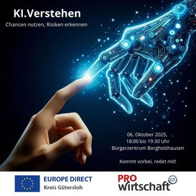 Das EUROPE DIRECT Kreis Gütersloh und seine Trägerorganisation, die pro Wirtschaft GT GmbH, laden zu einem Bürgerforum zum Thema Künstliche Intelligenz nach Borgholzhausen ein. Rouven Piesch, Leiter des EUROPE DIRECT, informiert darüber, warum KI im europäischen Kontext eine immer größere Rolle spielt. Als Gast spricht außerdem der KI-Experte Oliver Dietrich vom Kompetenzzentrum Arbeitswelt.Plus.