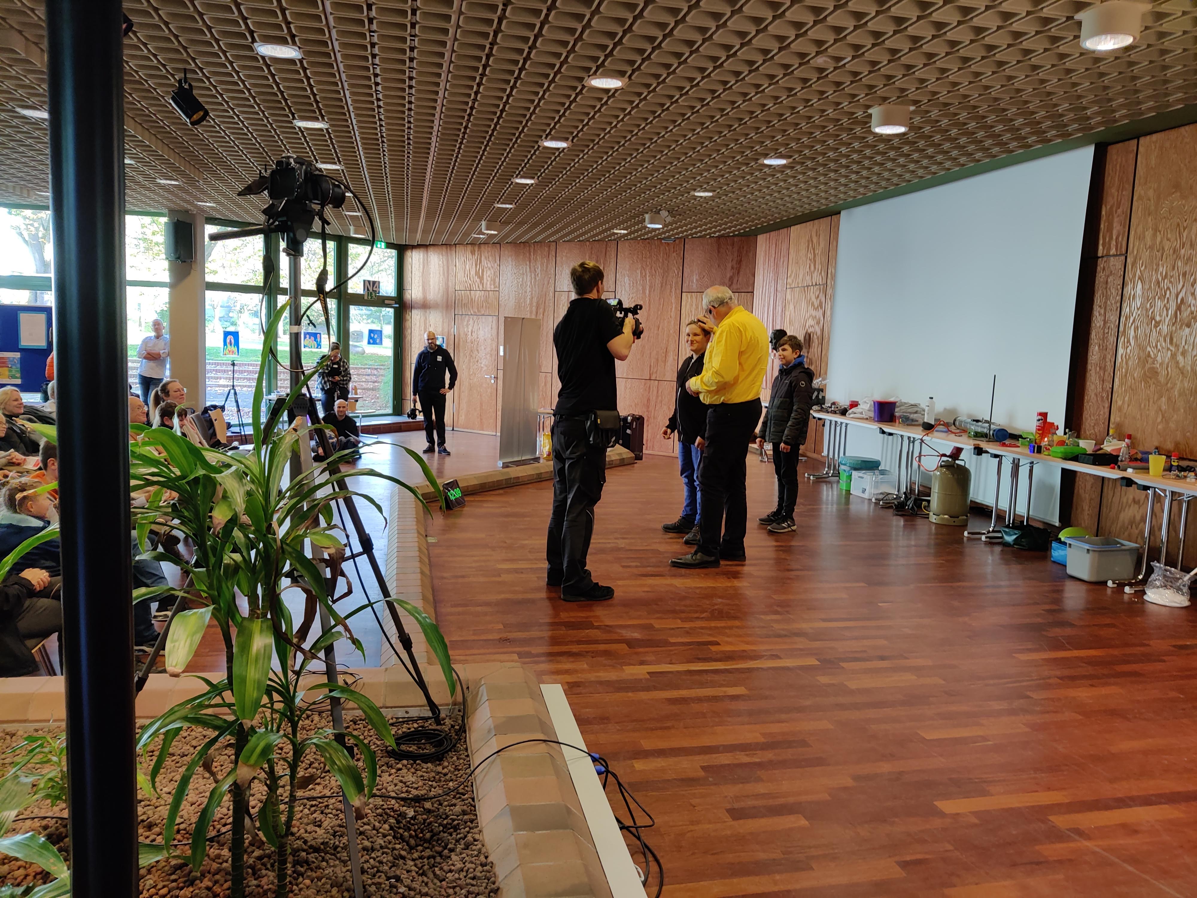 Darüber hinaus präsentierten sich 60 Ausssteller im Berufskolleg. Neben den Workshops konnten die Besucherinnen und Besucher zudem eine Vielzahl an offenen Angeboten besuchen. Im gesamten Schulgebäude gab es für die Gäste einiges zu sehen: Auf der Bühne im Forum entführte etwa der KI-Magier Jean Olivier mit dem zaubernden Roboter Sparky die Zuschauerinnen und Zuschauer auf eine magische Reise, auf der er verblüffende Tricks zeigte und dabei ohne Mühe mit dem sprechenden Roboter interagierte. Magisch war auch die Experimente-Show mit Eric Siemes, der mit der Kraft der Physik auf der Bühne Kuchen scheinbar schweben ließ, Tinte aus Äpfeln gewann und weitere verblüffende Phänomene zeigte.