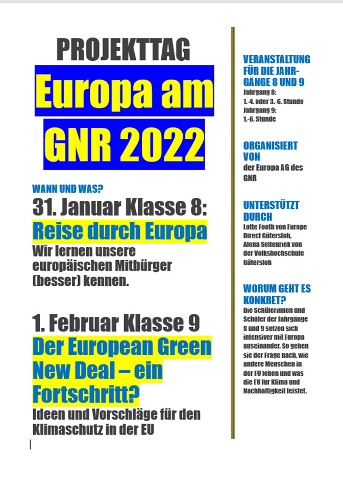 Am 1.2.2022 fand ein Projekttag zum Thema “Der European Green New Deal – ein Fortschritt?” in allen 9. Klassen statt. Inhalt und Ziel des Tages war es, sich mit den Themenbereichen Umwelt, Konsum, Energie und Mobilität in Bezug auf Nachhaltigkeit intensiv auseinanderzusetzen und sich in diesen Bereichen direkt an der Politik der Europäischen Union zu beteiligen. Unterstützt wurde die Planungsgruppe des GNR, bestehend aus Frau Amedick, Frau Jebe und Frau Urban (Mitglieder der Europa AG), von Frau Footh von Europe Direct Kreis Gütersloh. Am Projekttag selbst halfen Frau Dietrich und Herr Dr. Husicka vor Ort bei der Durchführung.