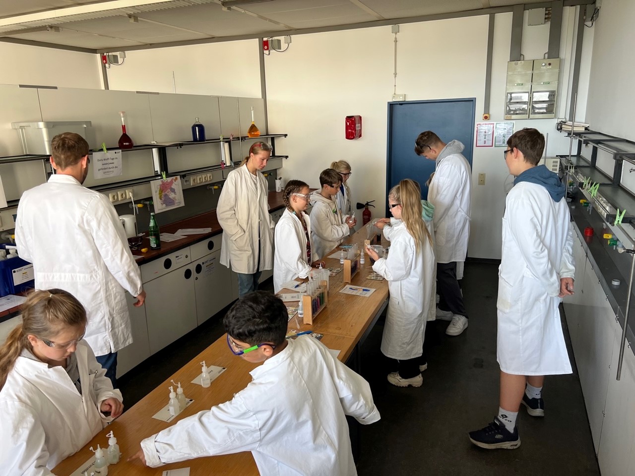 Die Schülerinnen und Schüler des MINT Profilkurses haben das Teutolab Chemie der Universität Bielefeld besucht. Dort haben sie, angeleitet von studentischen Hilfskräften, mit Grundschülern Experimente „Rund um die Zitrone“ durchgeführt. Im Duft-, Zauber- und Säurelabor wurde kräftig geforscht, z.B. wurden Motoren mit Propellern zum Laufen gebracht und herausgefunden, was man unter der „Zunge des Chemikers“ versteht.