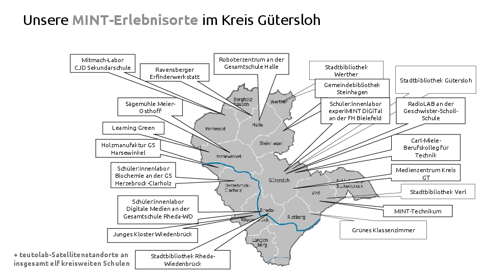 Hier findet ihr einen Überblick über unsere MINT-Erlebnisorte im Kreis Gütersloh und seht, wo sie sich befinden. Zum Vergrößern könnt ihr hier klicken.