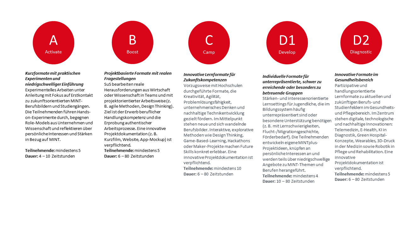 Für die Umsetzung von zdi-BSO-MINT-Maßnahmen kann ein Angebot aus fünf „BSO-MINT-Bausteinen“ zusammenstellt werden: